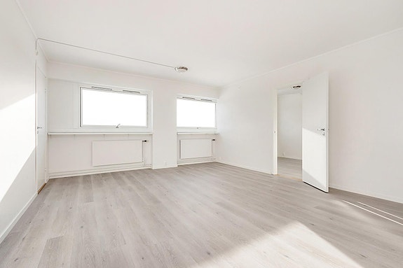 Entré, stue med åpen kjøkkenløsning, to soverom, bad