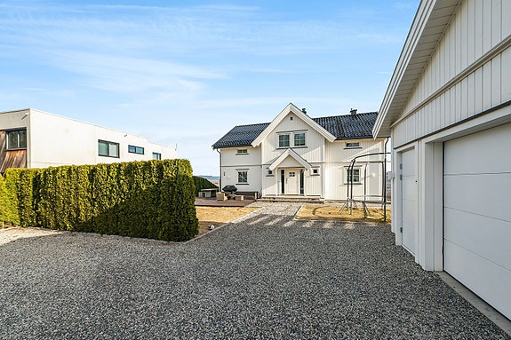 Fasade. Leiligheten har inngang på baksiden av boligen. Det medfølger 2 biloppstillingsplasser.