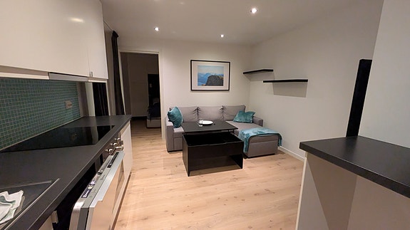 Lys og trivelig leilighet med åpen stue- og kjøkkenløsning. Leiligheten er fullt møblert og har integrerte hvitevarer, komplett utstyrt kjøkken samt praktisk arbeids-/spiseplass. På badet er det både vaskemaskin og tørketrommel. Stuen er innredet med (sove)sofa og et fleksibelt stuebord som enkelt kan heves og brukes som spisebord. Eget soverom med seng.