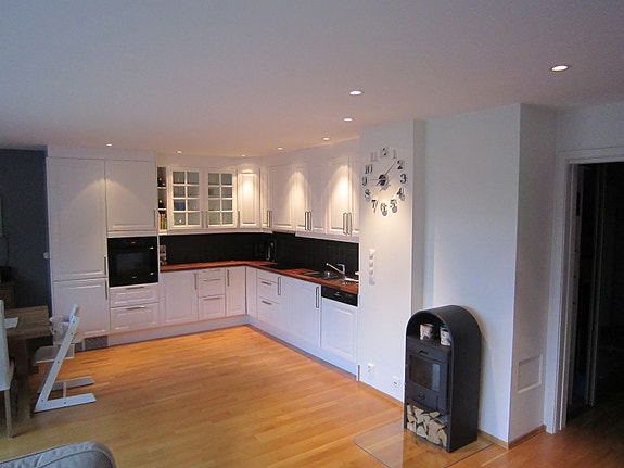 Åpen kjøkkenløsning med hvitt Sigdal kjøkken. Integrerte hvitevarer følger med. Valnøtt heltre benkeplante.