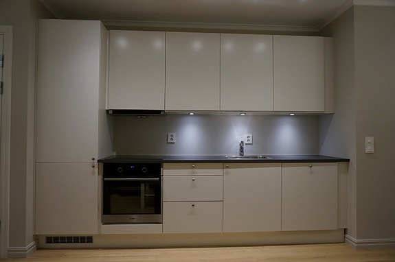 På kjøkken medfølger integrert stekeovn, integrert kjøleskap og oppvaskmaskin.
