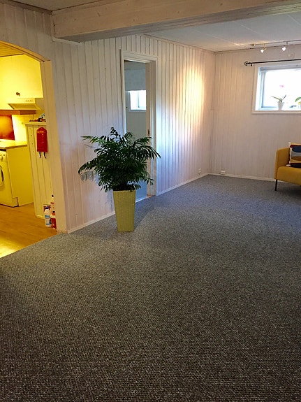 Stor lys vinkelstue, 2 gode soverom, kjøkken, bad og gang, egen inngang.