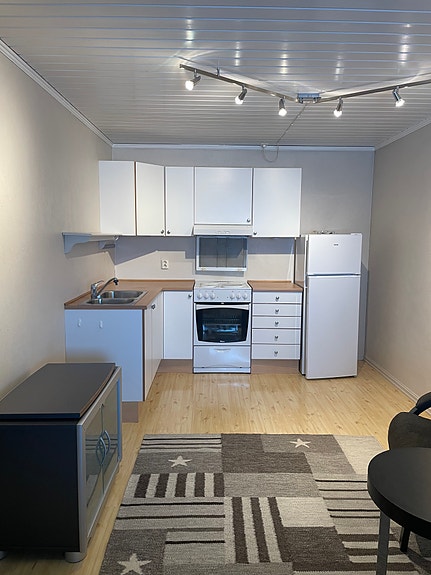 Vaskemaskin, tørketrommel, kjøleskap/fryser, komfyr/stekeovn, TV-møbel, hvilestol, lite bord, gulvteppe og garderobeskap er inventar (kan byttes med egne eiendeler)
