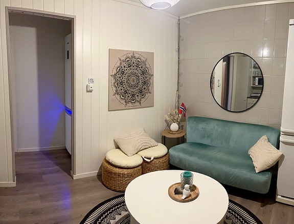 Hybelen er oppusset, kjøkkenet er utstyrt med komfyr, oppvaskmaskin, micro og 2 kjøl/frys, i tillegg til kjøkkenutstyr/service.