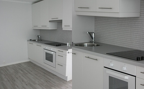 Kjøkkenkrok med vask/komfyr/platetopp og i dag også oppvaskmaskin. Kjøl/frys på motsatt vegg under benk