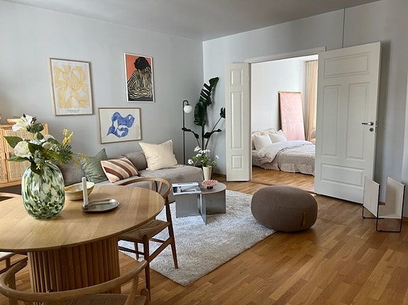No kan du leige eit stort og møblert soverom i ei lys og moderne 3-roms leilegheit på 68 m². Leilegheit er i ein klassisk bygard frå 1912, med høg standard, ekstra takhøgd og store vindauge som slepp inn rikeleg med dagslys. Dette er ein heim med både sjarm og eleganse, perfekt for deg som ønskjer noko meir enn berre ein stad å sove.