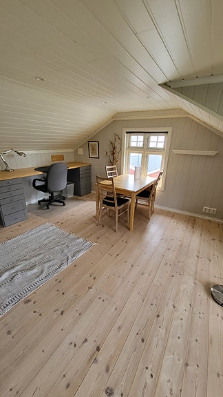 Stor pult, og ellers fleksibel innredning med sofa, evnt tv om ønskelig, spisebord og stoler.