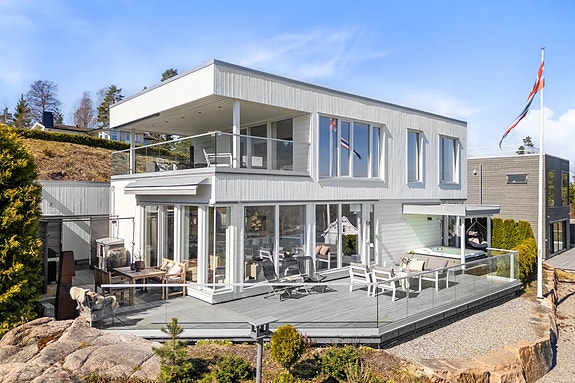 Moderne funkisbolig med panorama fjordutsikt, dobbelgarasje og flotte, solrike og usjenerte uteplasser
