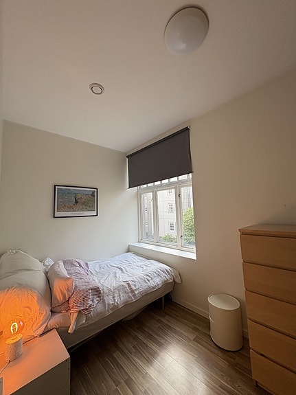 Rommet som leies ut er ca. 10–12 kvm, møblert med seng, kommode, klesskap og nattbord. Badet er lyst og enkelt å holde rent, og på badet har vi kombimaskin (vask/tørk). Kjøkkenet er oppgradert med nyere hvitevarer, inkludert komfyr, kjøleskap og fryser. Leiligheten ligger i en høy førsteetasje, som gir lite innsyn.