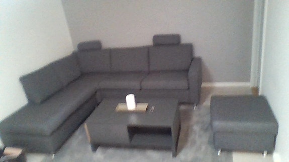 Fullt møblert: seng, garderobeskap, kommode, skrivebord, stol, TV, sofa/lenestol, hyller