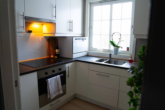 Sentralt beliggende kjellerleilighet med et soverom, strøm og internett inkludert. Integrert kjøleskap og oppvaskmaskin.
