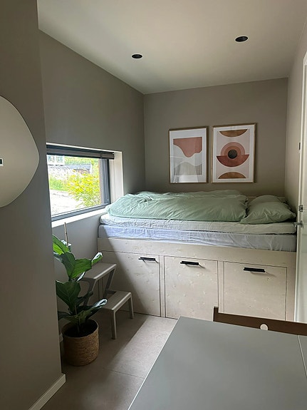 Vi har en ettroms hybel som er tilgjengelig med egen inngang og liten uteplass.