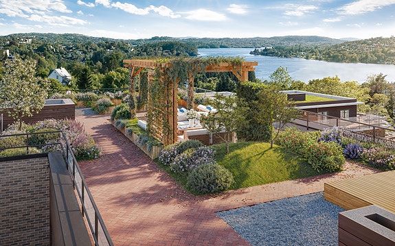 Flott, felles takterrasse med beplantning, sitteplasser og utsikt.