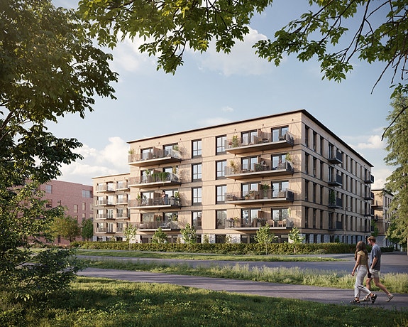 Velkommen til Skogmo Park, Bygg I - Salgstrinn 2! Her vil det bli oppført et bredt spekter av leiligheter; fra romslige 2-roms, innbydende 3-roms og familievennlige 4-roms. Illustrasjon av fasade - det vil forekomme avvik mellom illustrasjon og leveranse