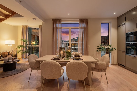 På toppen av Kuben ligger en ny og stilfull penthouseleilighet over to plan – med privat takterrasse og ytterligere to uteplasser som samlet byr på 87 m² med sol og panoramautsikt hele dagen.