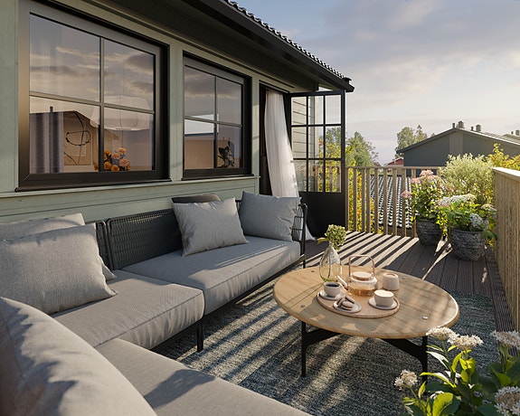 Hver bolig får praktisk parkering i garasje, det er trivelige tun med sosiale møteplasser rett utenfor døren. På Bjørkeåsen skal det være godt å bo for både liten og stor.