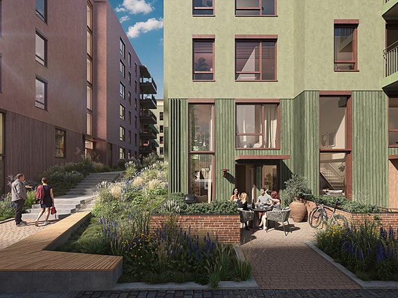 Vi har vært spesielt opptatt av overgangen mellom byggene og bakkeplan det er her livet mellom husene oppstår. En høy første etasje gir ekstra romhøyde til leilighetene på bakkeplan, og er kledd med panel som gir en enhetlig base og binder sammen kvartalet.