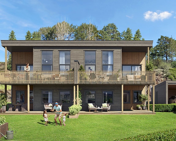 Inngangspartiet finner du i første etasje, her blir det 3 gode soverom og stue, evt. et 4. barnerom. her blir eget vaskerom og et romslig bad. Stuen har egen utgang til overbygd terrasse.