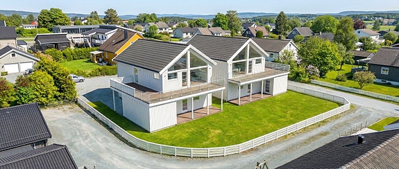 Her kommer det to flotte eneboliger med moderne arkitektur i et familievennlig boområde.