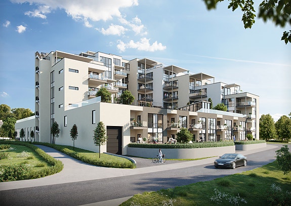 Dette blir et flott arkitektonisk utformet bygg med et moderne uttrykk, store vindusflater og generøse private balkonger og takterrasser. Prosjektet er tegnet med et tydelig trappet volum som gir flere leiligheter gode solforhold og utsikt, samt et skjermet felles grøntareal i tredje etasje.