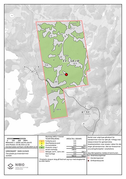 Eiendommen er på totalt ca. 964,4 daa. hvorav 664 daa. produktiv skog, 62 daa. uproduktiv skog og 236 daa. myr.