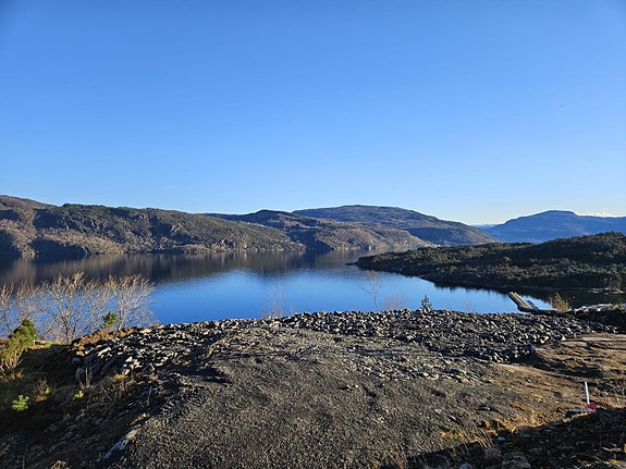 Eksisterende masse på tomten er planert ut og det er gruset en parkering slik at det lettere adkomst. Tomten ligger i enden av blindvei med panoramautsikt over fjorden.