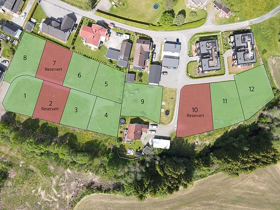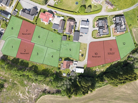 Tomtekart over de 12 byggeklare sør/vest vendte tomtene. Tomt med nr 1-8 til venstre og 9-12 til høyre