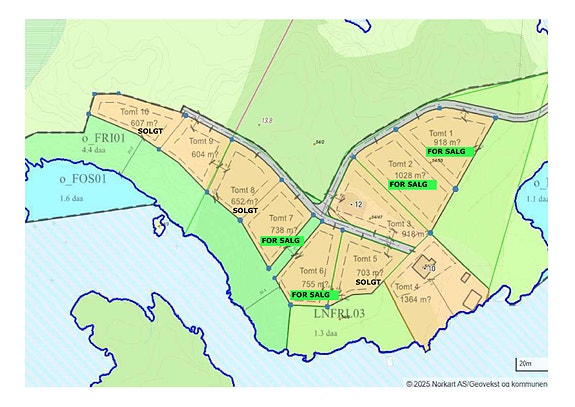 Det er totalt 4 tomter til salgs i størrelse fra 652 m2 til 1028 m2.
