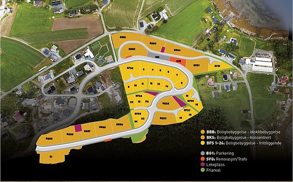 Plankart med reguleringsbestemmelser følger vedlagt i salgsoppgaven. Interessenter oppfordres til å gjøre seg kjent med disse, og er selv ansvarlig for å sette seg inn i bestemmelsene for bebyggelsen på hver eiendom. For ytterligere opplysninger om regulering, vennligst ta kontakt med megler.