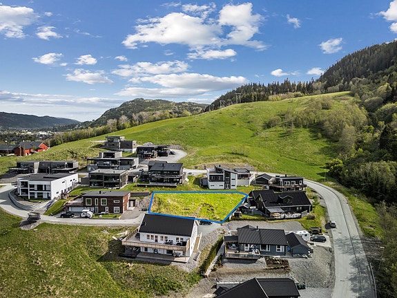 Tomten ligger innerst i en blindvei i et nyetablert boligområde bestående av villa eiendommer.