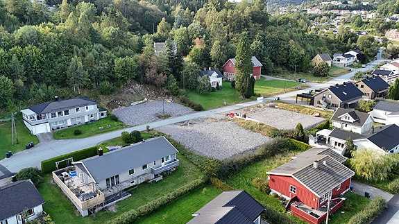 Tomtene er ferdig grov planerte, med vann, avløp, strøm og fiber lagt inn i tomta.