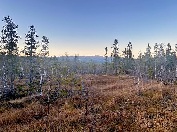 Solrikt og vestvendt panoramautsikt mot nordre Vegglifjell.
