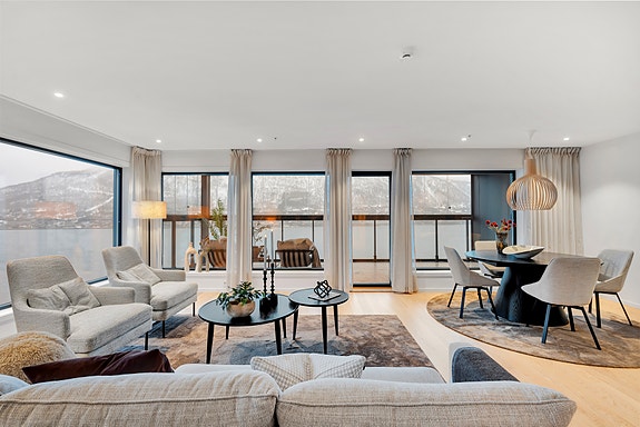 Stødige og tidløse materialvalg; 1-stavs eikeparkett, vannbåren varme i gulv, integrerte hvitevarer, smarthus- konsept og store vindusflater som gir rikelig med lysinnslipp er bare noen av kvalitetene du kan forvente.