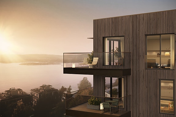 Høydepunktene er mange for de som flytter hjem til Fjordhøyden. Boligprosjektet får gode kvaliteter, grønne uteområder og ikke minst er utsikten et høydepunkt i seg selv. Området ligger vestvendt – på en høyde ved fjorden – som bader i ettermiddagssol.
