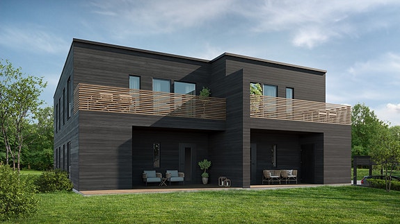 Boligene oppføres med tre som hovedmateriale med en tradisjonell bindingsverkskonstruksjon.
