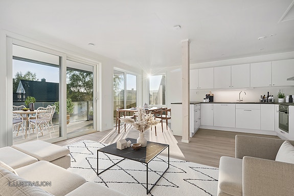 Leiligheten har to romslige soverom som gir god plass til både familie, gjester eller hjemmekontor. Den åpne stue- og kjøkkenløsningen skaper et naturlig samlingspunkt, med store vindusflater som slipper inn rikelig med dagslys og gir en luftig atmosfære. Fra stuen har du direkte utgang til en markterrasse, perfekt for rolige morgener med kaffe eller hyggelige kvelder med venner. Carport og boder.