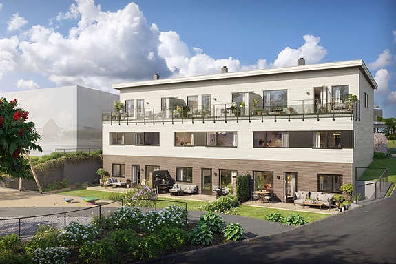 Tenk å flytte inn i et helt nytt hjem med gjennomtenkte løsninger. Slik blir det i de tre nye, nøkkelferdige rekkehusene over tre etasjer på attraktive Myklebust. Rekkehusene er utformet med tanke på