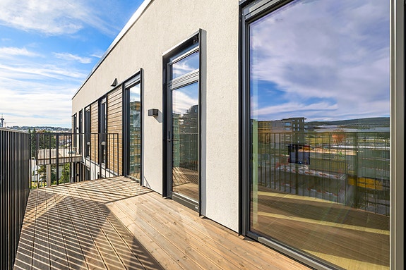 Nydelig toppleilighet i et attraktivt boligområde. Stor sørvestvendt takterrasse på 33 kvm. Bildeling & treningsrom.