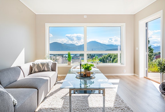 Her får du årstidene i all si prakt rett inn i stua, samtidig som du kan nyte gode dagar i ei lys, moderne og romsleg leilegheit. Store vindauge mot sør gir godt med dagslys inn.