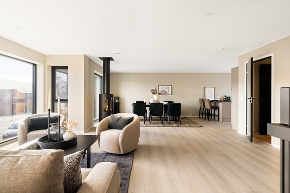 Stuen har åpen kjøkkenløsning og vil ha god plass til spisebord og sofagruppe. I tillegg er det direkte adgang til hagen fra kjøkkenet. Stuens vinduer vil være av god størrelse, som vil gi mye naturlig lys til rommet, samtidig som de bidrar til en herlig romfølelse. Det etableres også en loftstue med direkte utgang til solfylt takterrasse med gode utsiktsforhold.