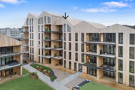 Leilighet 17 - Fasade. Bygg E. Leiligheten ligger i 4. og 5.etasje og har 2 uteplasser mot sørvest og 1 mot nordøst