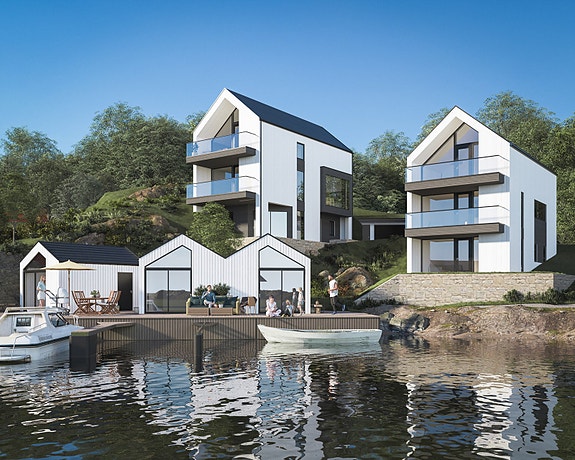 3 eneboliger i sjøkanten med privat brygge og naust. 1 solgt!