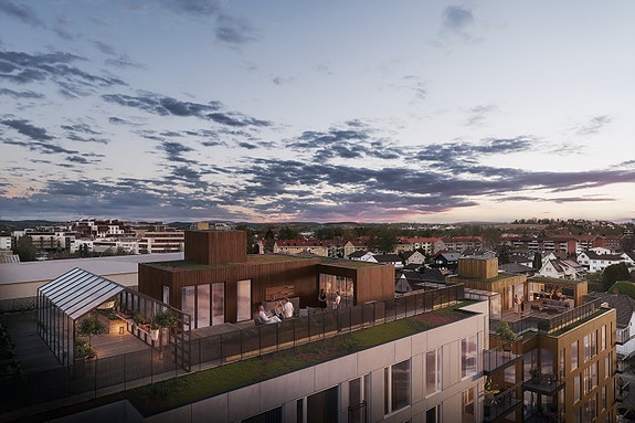 Som eier av leilighet i Lux Tetra får man fri tilgang til en innbydende, felles takterrasse og her finner man en takstue med både kjøkken og wc. På takterrassen blir det fine utearealer med svært gode solforhold. Utbygger leverer og bekoster full møblering både inne og ute samt egen utegrill til felles hygge og bruk. På borettslagets eiendom blir det også bygget en liten sandkasse for barn og barnebarn og alle bed blir levert med beplanting og selvvanningsanlegg hvor man bruker regnvann til vanning. Se ellers prospekt for beskrivelse av uteområder.