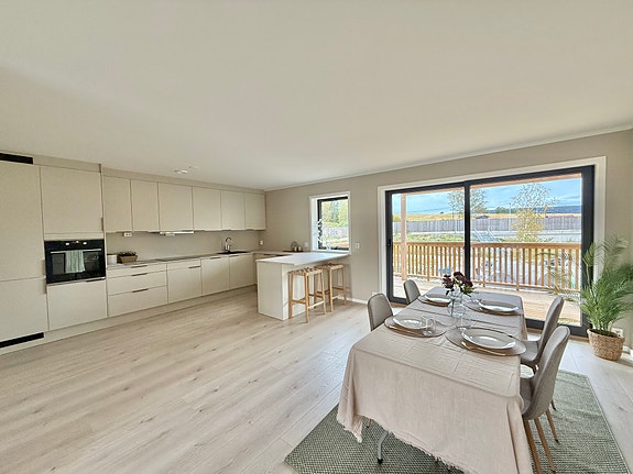 I andre etasje kommer du opp til et stort og luftig allrom, med kjøkken og stue i åpen løsning. Her finner du også boligens tredje soverom, og en stor, overbygget balkong med adkomst fra spisestue.