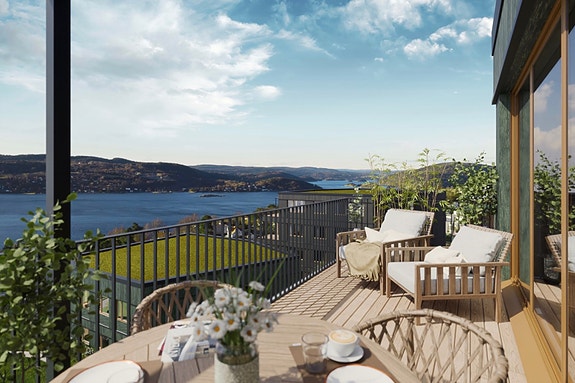 Øverst på fjellkammen, med sola og innseilingen til Drøbaksundet rett forut, skal det bygges 40 flotte selveierleiligheter. Her kan du nyte både utsikt og det gode liv i en splitter ny leilighet.