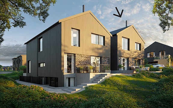 Her skal vi bygge 2 eneboliger med spennende fasader av lys teglstein og kledning. Den ene er solgt og den du nå kan sikre deg, er ca 147 m2.
