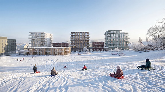 Kanskje Lunds største akebakke? Parken er et naturlig midtpunkt på Lund gjennom hele året. Her ser du Vabua Park trinn 1 med bygg A, B og C fra høyre mot venstre.