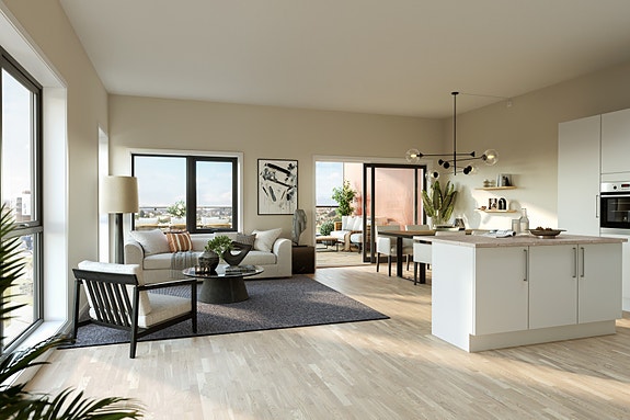 – Leilighetene varierer i størrelse fra 49 til 129 kvadratmeter. Uansett størrelse, har vi jobbet for å skape smarte planløsninger som gir alle leilighetene en romslig og luksuriøs følelse, med generøs takhøyde og gode oppholdsarealer, sier Austli.