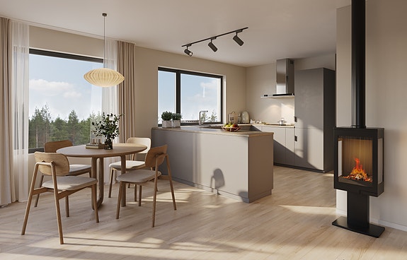 Boligene vil bli levert med balansert ventilasjon og vedovn sentralt plassert i stue/kjøkken.