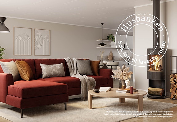 Alt materiell som 3D-illustrasjoner av felt og boliger, plantegninger, og bilder i annonser og prospekt er av illustrativ karakter, og kan inneholde innredninger og detaljer som ikke inngår i avtalen. Plantegninger er ikke i målestokk, og enkelte detaljer kan avvike noe fra endelige tegninger. Vi viser til leveransebeskrivelse i prospektet for flere detaljer om leveranseomfang.